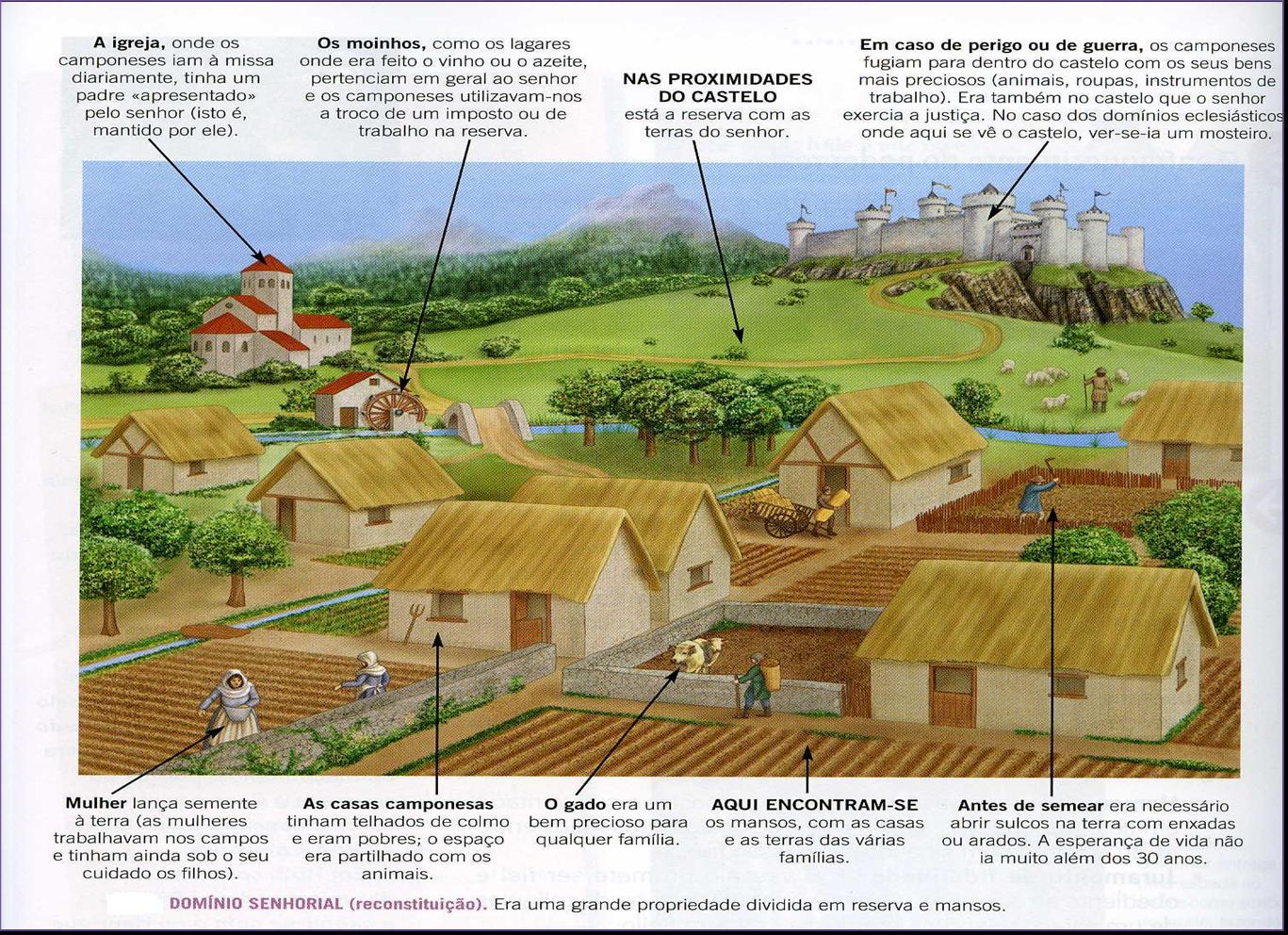 As terras senhoriais, ou senhorios, pertenciam aos senhores nobres que viviam numa casa acastelada situada na parte mais alta. À sua volta distribuíam-se campos cultivados, a floresta, o moinho e as casas dos camponeses que trabalhavam as terras.