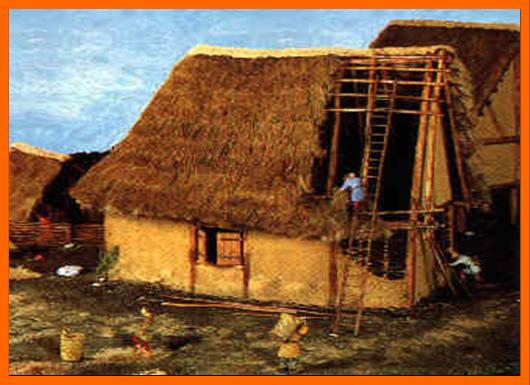 tecto de colmo, paredes de madeira ou pedra, quase sem aberturas, e chão em terra batida;