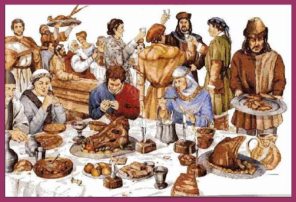 faziam-se normalmente duas refeições, o jantar e a ceia, onde predominava a carne, pão de trigo, vinho, queijo e um pouco de fruta.